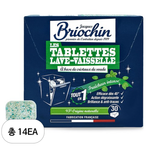 브리오신 식기세척기용 타블렛은 프레시민트향이 나는 주방세제로, 14개의 480g 포장으로 구성되어 있어 편리하게 사용할 수 있습니다.