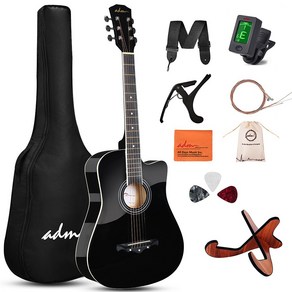 ADM 포크 기타 38인치 글로시 컷어웨이 스타터 세트 입문자용, 블랙, 1개