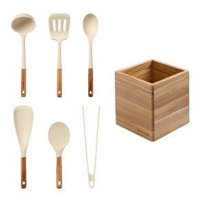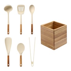 트루쿡 이탈리아산 올리브 실리콘 조리도구 6종 멀티함 세트, 1세트, 국자+뒤집개+서빙스푼+멀티스푼+주걱+집게+멀티함