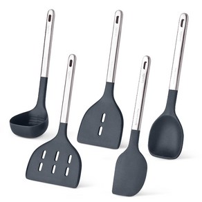 스텐 304 소재 손잡이와 실리콘 헤드가 결합된 조리도구 세트로 위생성과 내구성이 뛰어나며 국자, 뒤집개, 와이드 뒤집개, 스파츌라, 요리스푼 구성으로 다양한 요리에 활용 가능하고 딥 차콜 컬러로 깔끔한 주방 연출이 가능한 제품이다.
