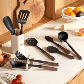 월넛 우드 손잡이와 실리콘 소재가 결합된 프리미엄 조리도구 세트로 내열성과 내구성이 뛰어나며 국자, 뒤집개, 스푼 등 10종 구성으로 다양한 요리에 활용 가능하고 코팅 팬에도 손상을 주지 않아 실용성과 디자인을 함께 갖춘 주방용 제품이다.